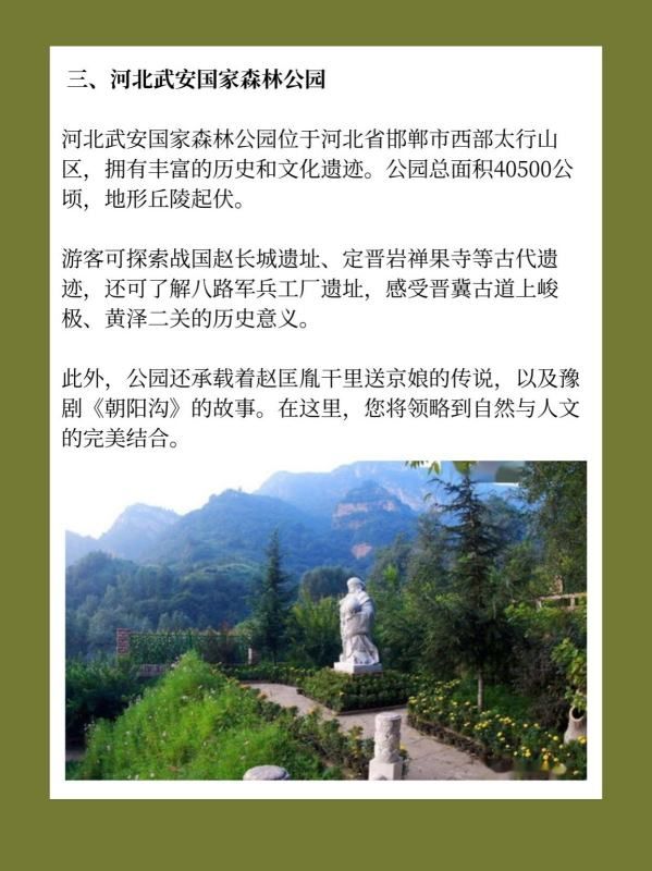 河北武安国家森林公园位于河北省邯郸市西部太行山区,拥有丰富的历史和文化遗迹。公园总面积40500公顷,地形丘陵起伏。