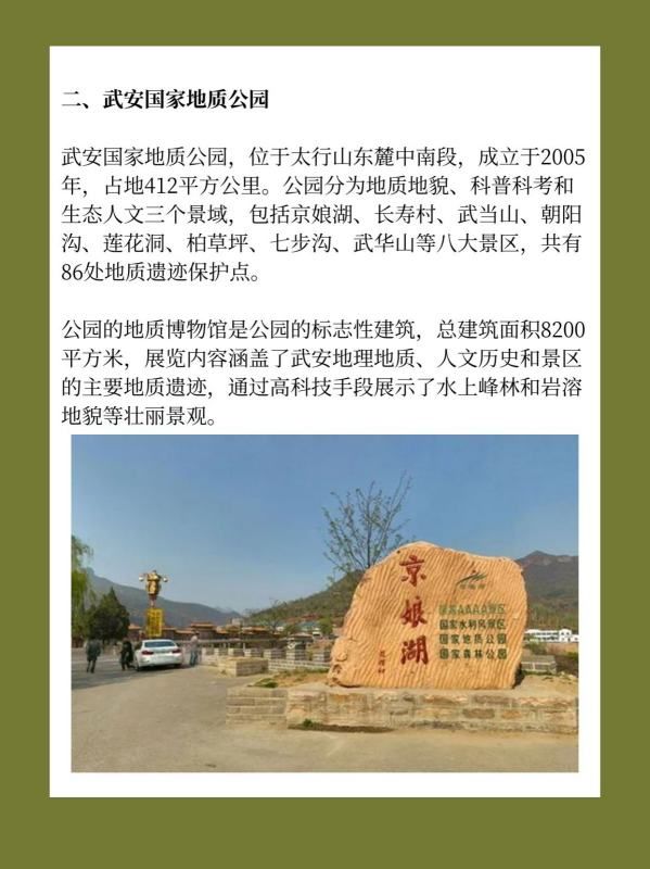 武安国家地质公园,位于太行山东麓中南段,成立于2005年,占地412平方公里。公园分为地质地貌、科普科考和生态人文三个景域,包括京娘湖、长寿村、武当山、朝阳沟、莲花洞、柏草坪、七步沟、武华山等八大景区,共有86处地质遗迹保护点。