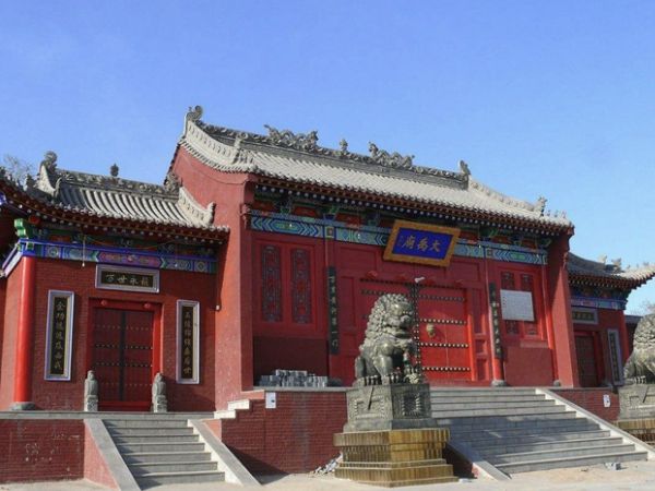 大佛殿雄伟壮观,单檐歇山顶,面阔5间,进深6椽,墙厚面向上收分,檐柱藏在墙体之中,柱头稍露,前檐当心间开门,次稍间檐墙正中上部均开窗口,安装直棂格窗,恰似蒙古包形。