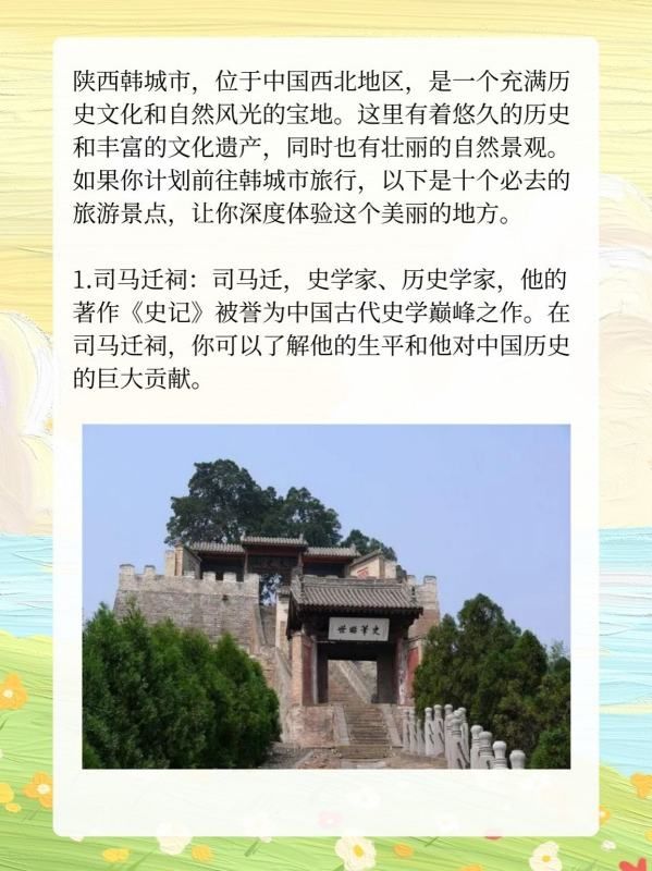 陕西韩城市,位于中国西北地区,是一个充满历史文化和自然风光的宝地。这里有着悠久的历史和丰富的文化遗产,同时也有壮丽的自然景观。如果你计划前往韩城市旅行,以下是十个必去的旅游景点,让你深度体验这个美丽的地方。