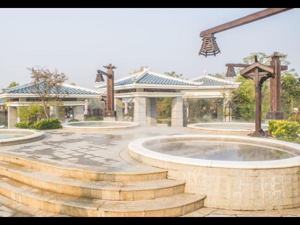 利用天然优质矿泉水建造了星座池、生肖池、五行池风格各异的室外园林式汤池和室内中庭式汤池,并开发了名花汤、名酒汤、名木汤、矿砂浴、石板浴、盐浴、泥浴、氡汽浴、天体浴等适合各类客人的SPA水疗设施。