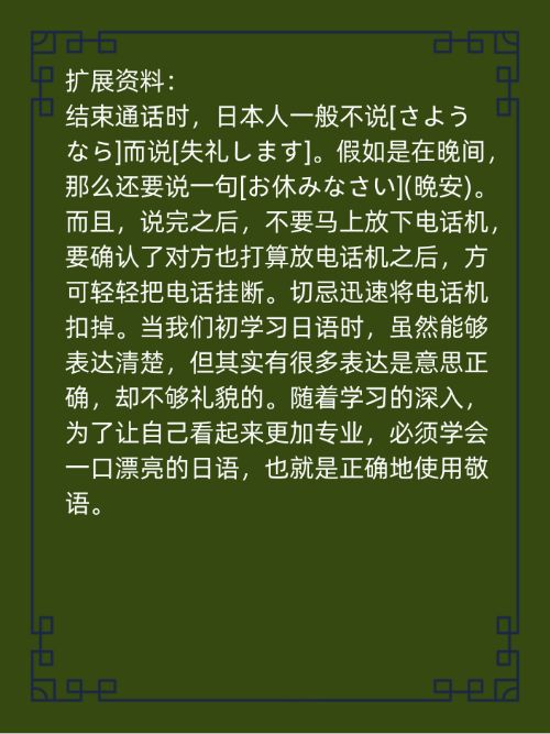 结束通话时,日本人一般不说[さようなら]而说[失礼します]。假如是在晚间,那么还要说一句[お休みなさい](晩安)。而且,说完之后,不要马上放下电话机,要确认了对方也打算放电话机之后,方可轻轻把电话挂断。切忌迅速将电话机扣掉。