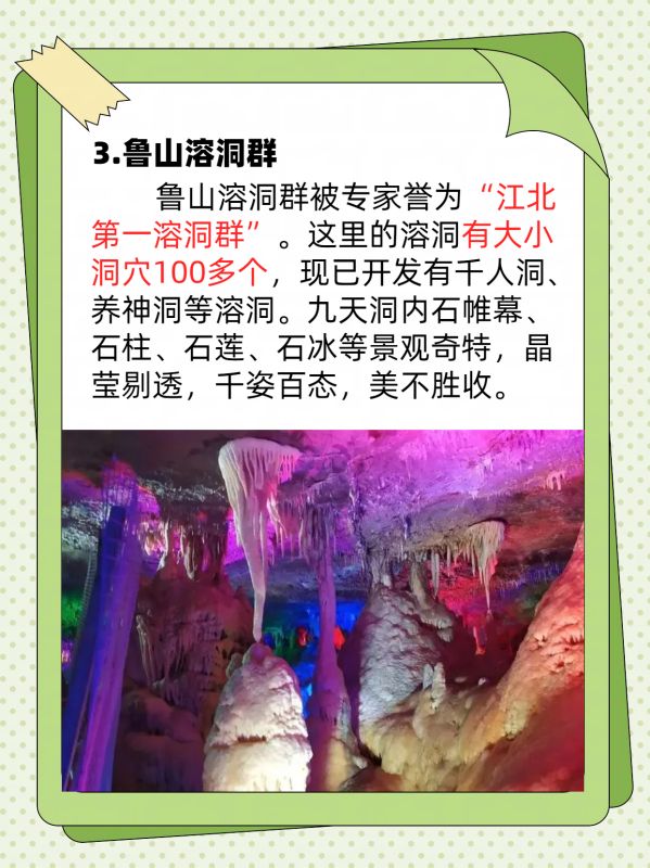 鲁山溶洞群被专家誉为“江北第一溶洞群”。这里的溶洞有大小洞穴100多个,现已开发有千人洞、养神洞等溶洞。九天洞内石帷幕、石柱、石莲、石冰等景观奇特,晶莹剔透,千姿百态,美不胜收。