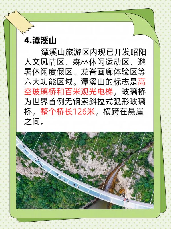 潭溪山旅游区内现已开发昭阳人文风情区、森林休闲运动区、避暑休闲度假区、龙脊画廊体验区等六大功能区域。潭溪山的标志是高空玻璃桥和百米观光电梯,玻璃桥为世界首例无钢索斜拉式弧形玻璃桥,整个桥长126米,横跨在悬崖之间。