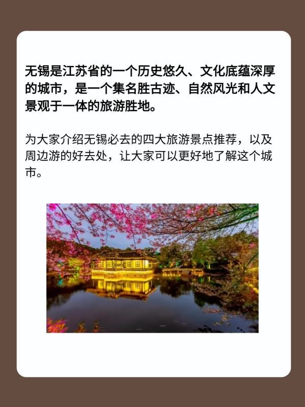 无锡是江苏省的一个历史悠久、文化底蕴深厚的城市,是一个集名胜古迹、自然风光和人文景观于一体的旅游胜地。为大家介绍无锡必去的四大旅游景点推荐,以及周边游的好去处,让大家可以更好地了解这个城市。