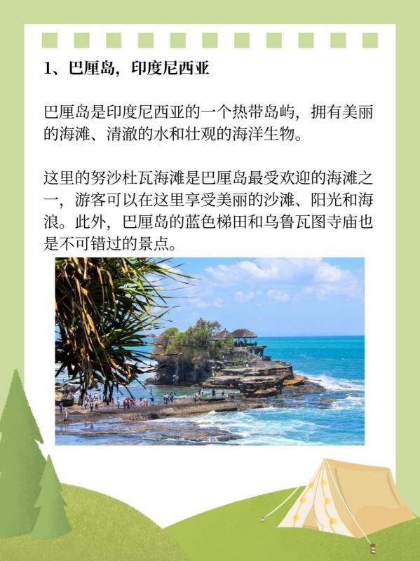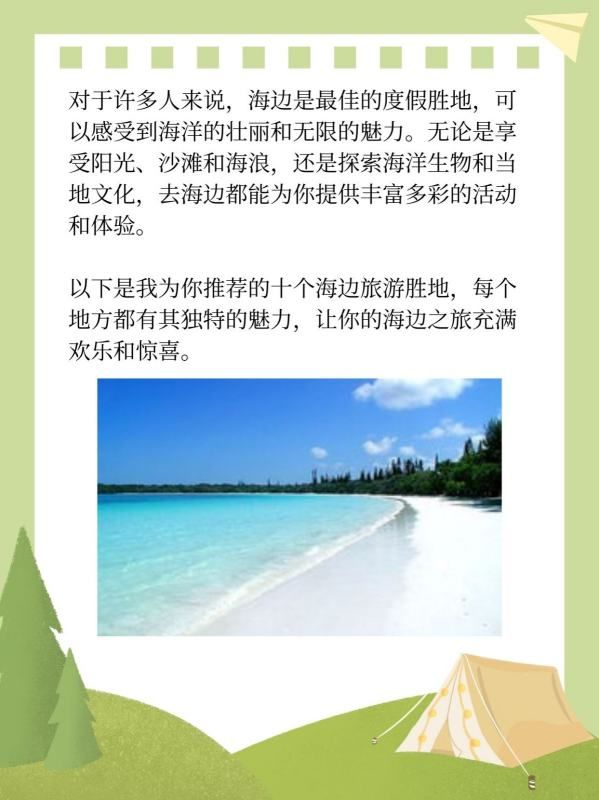 以下是我为你推荐的十个海边旅游胜地,每个地方都有其独特的魅力,让你的海边之旅充满欢乐和惊喜。