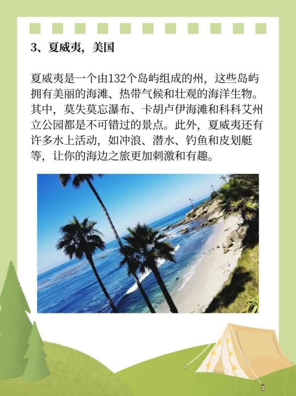 夏威夷是一个由132个岛屿组成的州,这些岛屿拥有美丽的海滩、热带气候和壮观的海洋生物。其中,莫失莫忘瀑布、卡胡卢伊海滩和科科艾州立公园都是不可错过的景点。此外,夏威夷还有许多水上活动,如冲浪、潜水、钓鱼和皮划艇等,让你的海边之旅更加刺激和有趣。