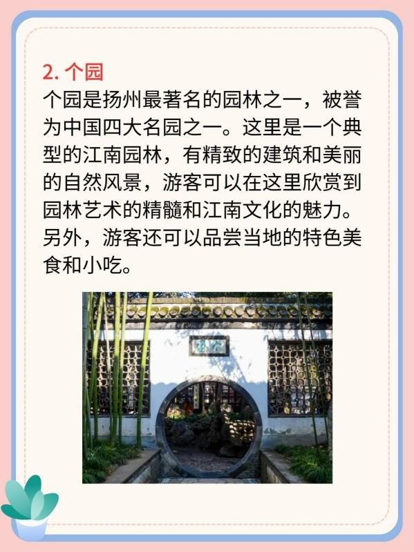 个园是扬州最著名的园林之一,被誉为中国四大名园之一。这里是一个典型的江南园林,有精致的建筑和美丽的自然风景,游客可以在这里欣赏到园林艺术的精髓和江南文化的魅力。另外,游客还可以品尝当地的特色美食和小吃。