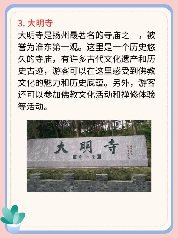 大明寺是扬州最著名的寺庙之一,被誉为淮东第一观。这里是一个历史悠久的寺庙,有许多古代文化遗产和历史古迹,游客可以在这里感受到佛教文化的魅力和历史底蕴。另外,游客还可以参加佛教文化活动和禅修体验等活动。