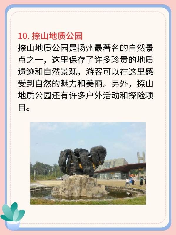 捺山地质公园是扬州最著名的自然景点之一,这里保存了许多珍贵的地质遗迹和自然景观,游客可以在这里感受到自然的魅力和美丽。另外,捺山地质公园还有许多户外活动和探险项目。