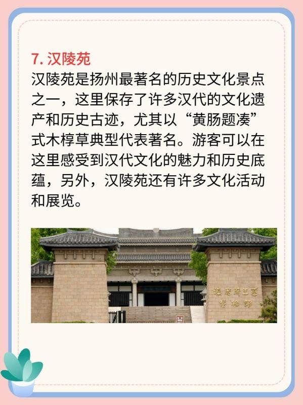 汉陵苑是扬州最著名的历史文化景点之一,这里保存了许多汉代的文化遗产和历史古迹,尤其以“黄肠题凑”式木椁草典型代表著名。游客可以在这里感受到汉代文化的魅力和历史底蕴,另外,汉陵苑还有许多文化活动和展览。