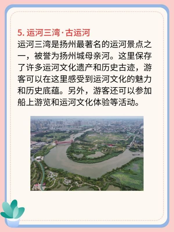 运河三湾是扬州最著名的运河景点之一,被誉为扬州城母亲河。这里保存了许多运河文化遗产和历史古迹,游客可以在这里感受到运河文化的魅力和历史底蕴。另外,游客还可以参加船上游览和运河文化体验等活动。