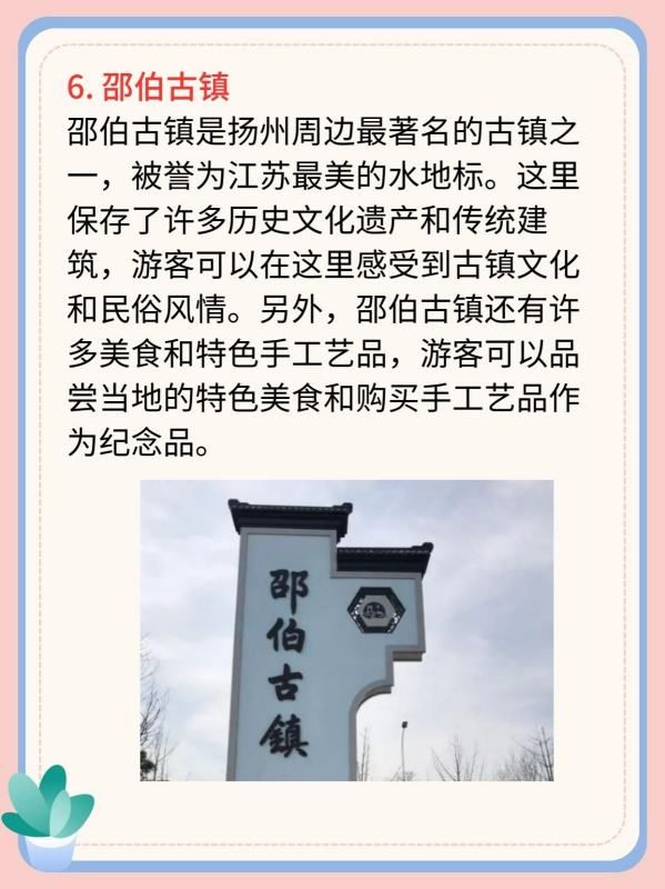 邵伯古镇是扬州周边最著名的古镇之一,被誉为江苏最美的水地标。这里保存了许多历史文化遗产和传统建筑,游客可以在这里感受到古镇文化和民俗风情。另外,邵伯古镇还有许多美食和特色手工艺品,游客可以品尝当地的特色美食和购买手工艺品作为纪念品。