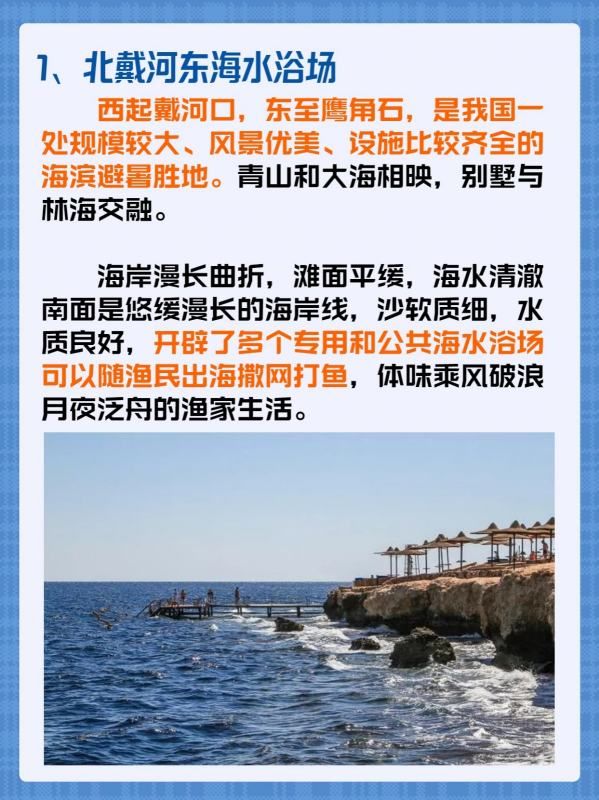 西起戴河口,东至鹰角石,是我国一处规模较大、风景优美、设施比较齐全的海滨避暑胜地。青山和大海相映,别墅与林海交融。