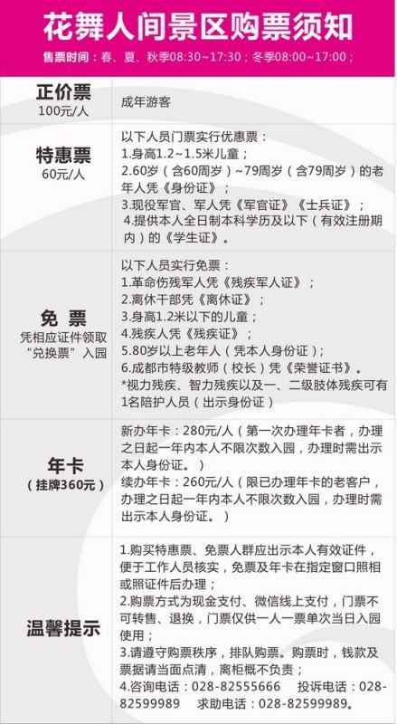 截止2020年3月,花舞人间门票为100元/人。优惠信息: