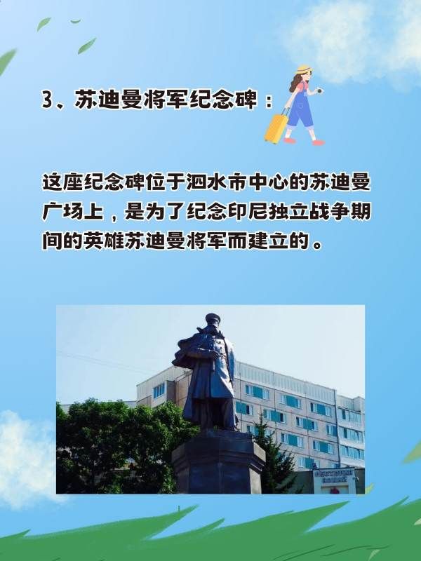 这座纪念碑位于泗水市中心的苏迪曼广场上,是为了纪念印尼独立战争期间的英雄苏迪曼将军而建立的。