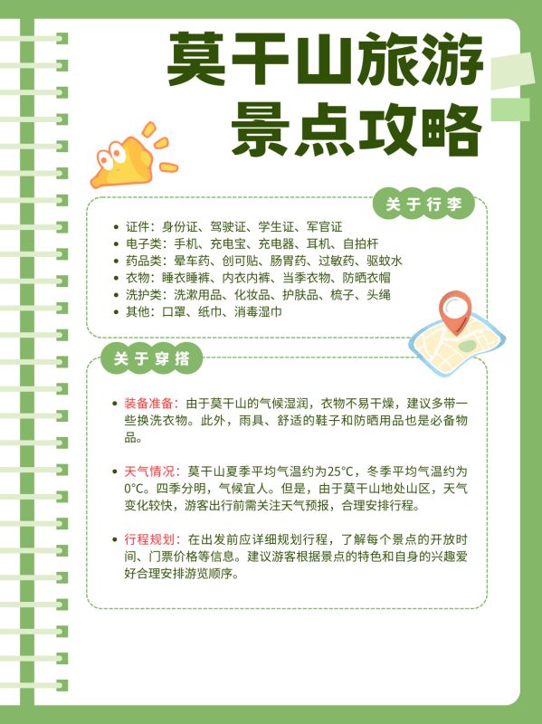 装备准备:由于莫干山的气候湿润,衣物不易干燥,建议多带一些换洗衣物。此外,雨具、舒适的鞋子和防晒用品也是必备物品。