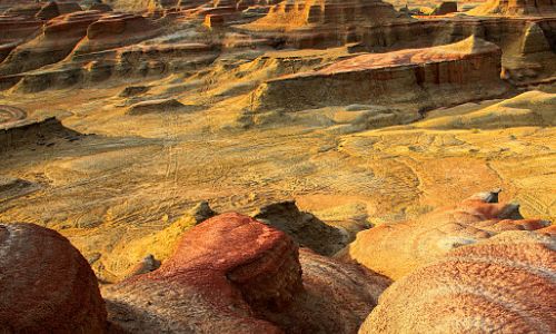 五彩湾是戈壁荒漠中五彩缤纷的世界,以怪异、神秘、壮美而著名。若适逢黄昏,登高远望,整个五彩湾被落日点燃,如火如炽,让人心潮澎湃,热血沸腾。