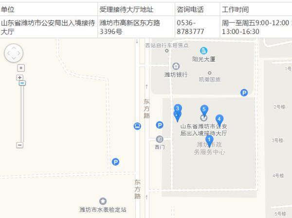 山东省潍坊市公安局出入境接待大厅地址:潍坊市高新区东方路3396号
