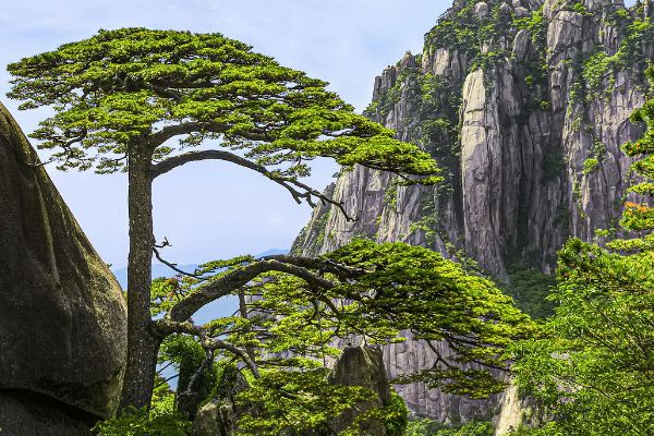 迎客松树干中间长出了两根侧枝,长度达到了7.6米。就像热情好客的主人一样,它伸出手臂,热烈欢迎来自世界各地的客人来参观黄山。松树不仅是黄山的象征,也是全国人民的自豪。