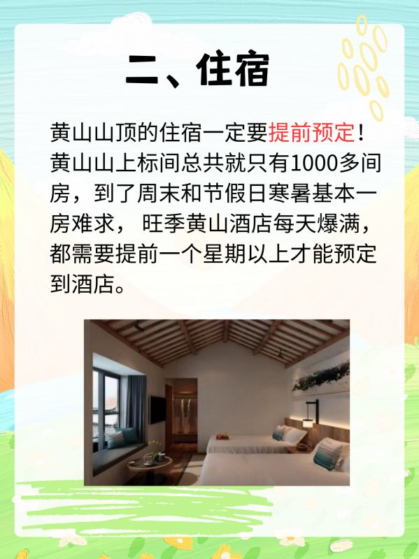 3. 住宿选择:黄山风景区内有多个住宿点,包括山顶上的酒店和山下的客栈。如果计划在山顶上观赏日出,建议选择山顶上的酒店。如果预算有限,可以选择山下的客栈。