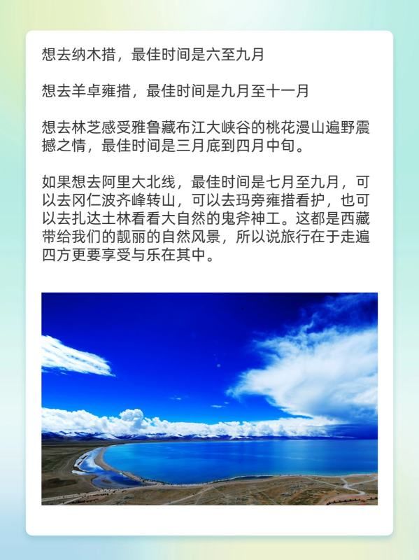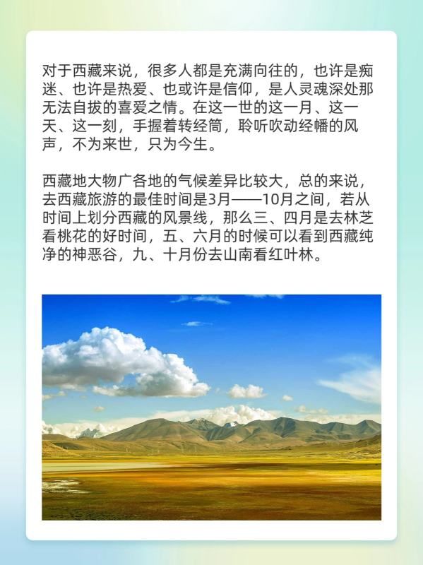 西藏地大物广各地的气候差异比较大,总的来说,去西藏旅游的最佳时间是3月——10月之间,若从时间上划分西藏的风景线,那么三、四月是去林芝看桃花的好时间,五、六月的时候可以看到西藏纯净的神恶谷,九、十月份去山南看红叶林。