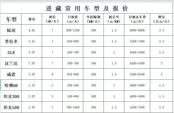 就拿我们之前租的丰田普拉多来说吧,4月份是700-800元一天,拉萨还车费6000元,租车自驾一趟川藏线大概花费一万二三,不含油费。等到7、8月份人开始多起来后就是800-900一天,拉萨还车费6500,10天川藏行花费16000,这个价格其实是有点小贵的。