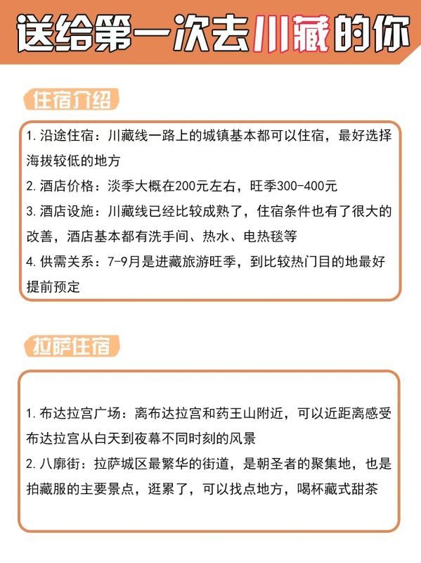 旺季一点要提前预订,房源有限,如果临时订,要么没房,要么只能住的将就。另外,尽量选择低海拔住2宿,如果要住高海拔地区,建议选择供氧酒店。
