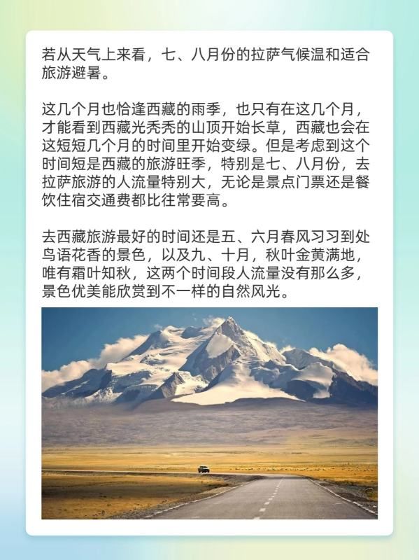 每年的7-9三个月被称为西藏的“黄金季节”,是旅游旺季,从气候条件来看,选择4-10月份进藏最为适宜。而7-8月因为暑期的原因,各地赴藏旅游人数最多,也是当地最旺的两个月,物价飞涨,团费也是最贵的时候。9月的西藏,雨季刚过,气候适宜,旅客减少,价格适中,值得一去。