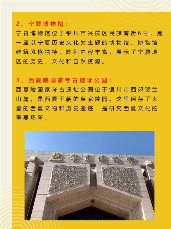 宁夏博物馆位于银川市兴庆区民族南街6号,是一座以宁夏历史文化为主题的博物馆。博物馆建筑风格独特,陈列内容丰富,展示了宁夏地区的历史、文化和自然资源。