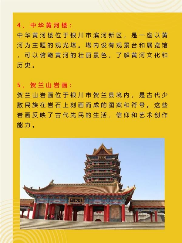 中华黄河楼位于银川市滨河新区,是一座以黄河为主题的观光塔。塔内设有观景台和展览馆,可以俯瞰黄河的壮丽景色,了解黄河文化和历史。