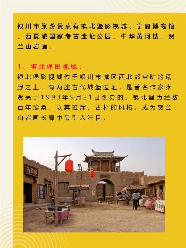 镇北堡影视城位于银川市城区西北郊空旷的荒野之上,有两座古代城堡遗址,是著名作家张贤亮于1993年9月21日创办的。镇北堡历经数百年沧桑,以其雄浑、古朴的风格,成为贺兰山岩画长廊中最引人注目。