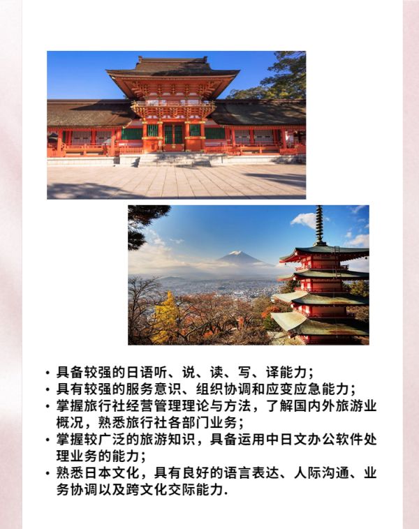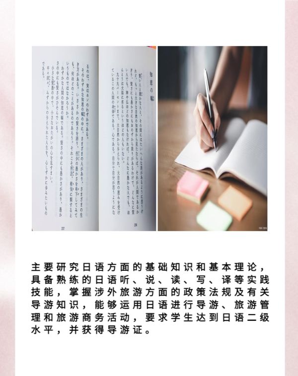 主要研究日语方面的基础知识和基本理论,具备熟练的日语听、说、读、写、译等实践技能,掌握涉外旅游方面的政策法规及有关导游知识,能够运用日语进行导游、旅游管理和旅游商务活动,要求学生达到日语二级水平,并获得导游证。