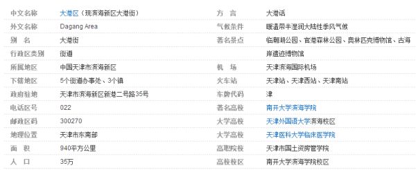 大港区(现滨海新区大港街)成立于1979年11月6日,系从天津市南郊区分设出来,是天津市重要的重工业基地。地处天津市东南,东临渤海湾、塘沽;南与河北省黄骅市接壤;西与静海区为邻;北与津南、西青两区交界,地势平坦,平均海拔3米。东部多为滩涂,中部有面积为22万亩的大港水库,西部和西南部为肥沃的农田。全区共辖3个镇、5个街道办事处、60个居民委员会。大港区区位优势明显。距北京165公里,距天津新港28公里,距天津滨海国际机场40公里,205国道、荣乌高速、李港铁路穿境,长深、津晋高速公路与津港公路相联,交通极为便捷。大港区资源丰富。已探明石油储藏量8.87亿吨,天然气储量360.5亿立方米。内陆水域面积达36万亩。有华北地区最大的人工平原水库——北大港水库,总面积147平方公里,蓄水量可达5亿立方米。地热资源丰富,地热分布面积62平方公里,热水井出口温度在94℃—96℃之间,出水量为500吨/日。