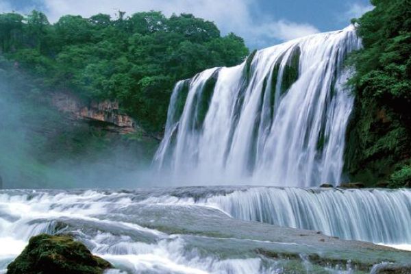 奔腾的白水河在这里从悬崖绝壁上直泻而下,形成九级瀑布,落差共为105.4米,漩涡无数,声如雷鸣,响达千米。水雾经阳光折射,五彩缤纷,变幻无穷,气象万千,风景极为壮观。
