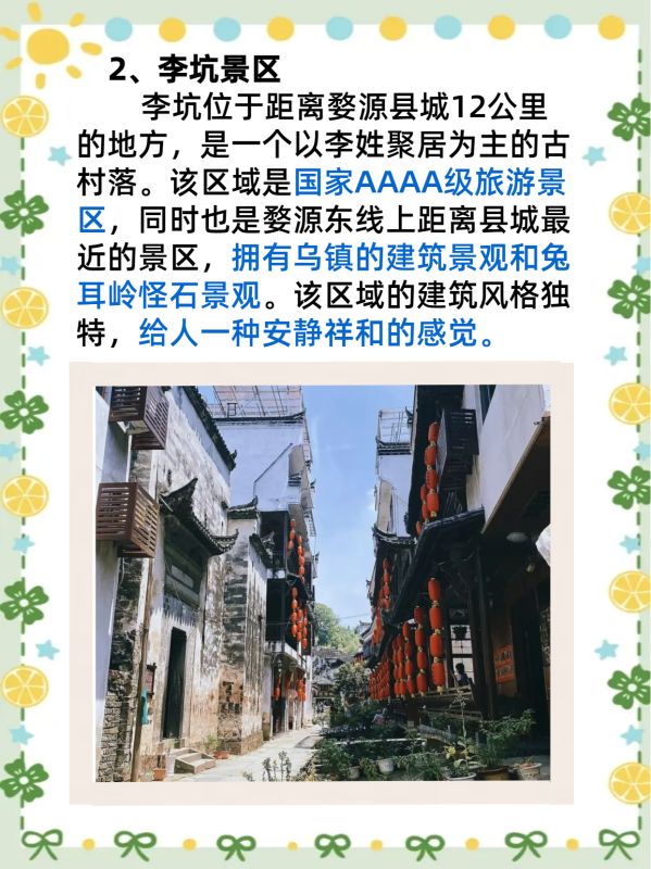 李坑位于距离婺源县城12公里的地方,是一个以李姓聚居为主的古村落。该区域是国家AAAA级旅游景区,同时也是婺源东线上距离县城最近的景区,拥有乌镇的建筑景观和兔耳岭怪石景观。该区域的建筑风格独特,给人一种安静祥和的感觉。
