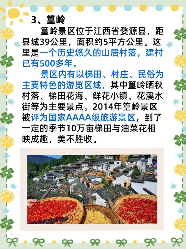 篁岭景区位于江西省婺源县,距县城39公里,面积约5平方公里。这里是一个历史悠久的山居村落,建村已有500多年。景区内有以梯田、村庄、民俗为主要特色的游览区域,其中篁岭晒秋村落、梯田花海、鲜花小镇、花溪水街等为主要景点。2014年篁岭景区被评为国家AAAA级旅游景区,到了一定的季节10万亩梯田与油菜花相映成趣,美不胜收。