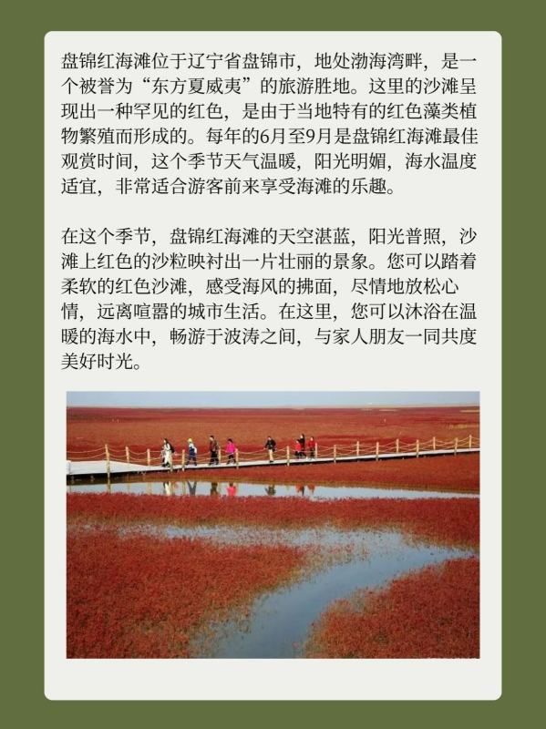 盘锦红海滩位于辽宁省盘锦市,地处渤海湾畔,是一个被誉为“东方夏威夷”的旅游胜地。这里的沙滩呈现出一种罕见的红色,是由于当地特有的红色藻类植物繁殖而形成的。每年的6月至9月是盘锦红海滩最佳观赏时间,这个季节天气温暖,阳光明媚,海水温度适宜,非常适合游客前来享受海滩的乐趣。