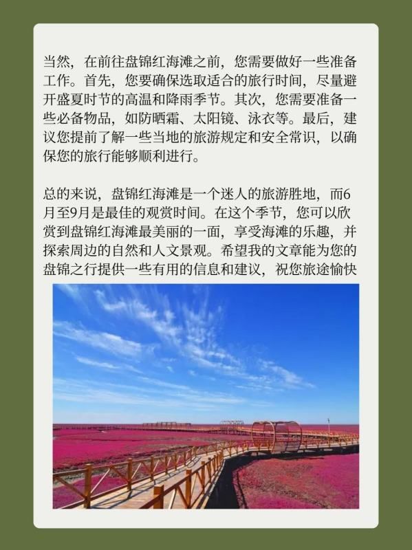 当然,在前往盘锦红海滩之前,您需要做好一些准备工作。首先,您要确保选取适合的旅行时间,尽量避开盛夏时节的高温和降雨季节。其次,您需要准备一些必备物品,如防晒霜、太阳镜、泳衣等。最后,建议您提前了解一些当地的旅游规定和安全常识,以确保您的旅行能够顺利进行。