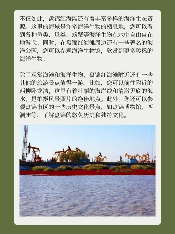 不仅如此,盘锦红海滩还有着丰富多样的海洋生态资源。这里的海域是许多海洋生物的栖息地,您可以看到各种鱼类、贝类、螃蟹等海洋生物在水中自由自在地游弋。同时,在盘锦红海滩周边还有一些著名的海洋公园,您可以参观海洋生物馆,欣赏到更多珍稀的海洋生物。