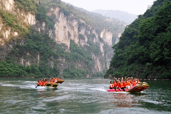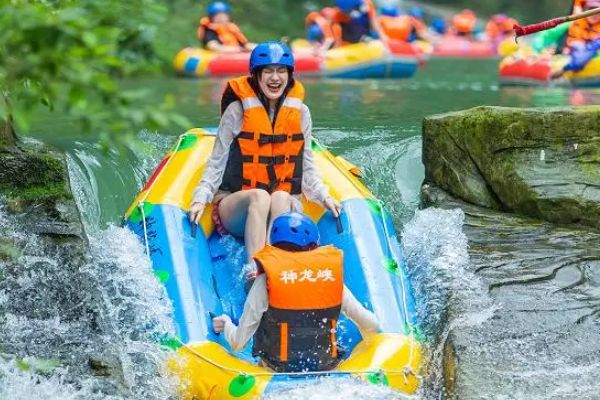 全长5公里,其中上游1.5公里惊险刺激,水流湍急,时左时右,或直下入潭,或连续冲滩,游客始终与浪共舞。