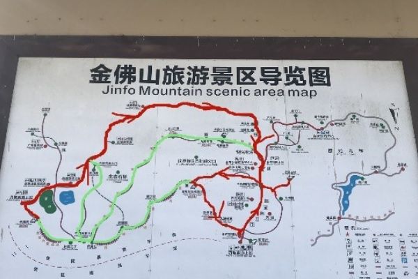 金佛山景区西门—索道上站广场—九堤探源—观佛阁—金龟朝阳—箭竹林海—天堂街—剑谷坪滑雪场—西坡索道上站—返程。