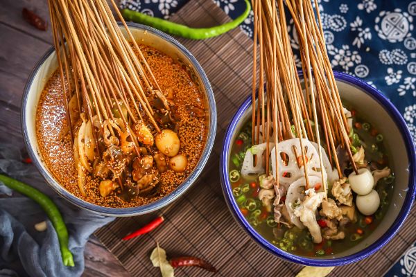 钵钵鸡一般用称为“钵”的瓦罐,盛放着配以麻辣为主的佐料,菜品在特殊加工后用签串制,晾冷浸于各种口味的佐料中。在钵钵鸡店外小小的方桌一坐,食材冰凉的口感,再配合着火辣鲜甜的味道,串串荤素搭配,各有各的香,一次,便叫你酣畅淋漓。
