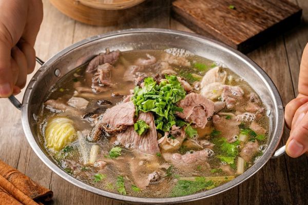 作为乐山的非物质文化遗产,跷脚牛肉是乐山大街小巷中绝对少不了的一道美味。跷脚牛肉馆子多数店面不大,几套木桌椅就足够。门口与案台相连的是一口大锅,里面咕噜咕噜地熬着牛肉汤,香味四溢。案台上陈放着切成薄片的牛肉和牛肚、牛心、牛舌等,口感各有所长,毛肚脆劲,牛舌绵软,黄喉厚道。