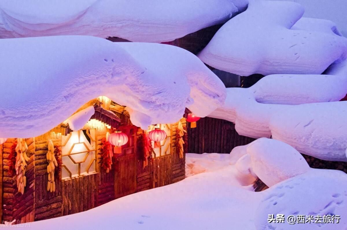 12月的雪乡,银装素裹,如玉树琼枝,美如仙境。雪乡原名双峰林场,位于黑龙江省牡丹江市。这里的雪质优良,粘度高,落在屋顶、树枝、粮仓、栅栏上不会掉落,形成了独特的雪景。夜