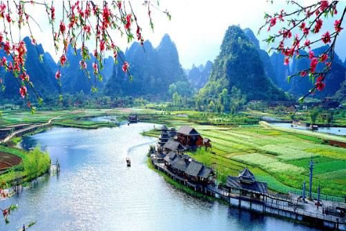 我才刚从桂林回来,去了阳朔的世外桃源。我们先需坐游船进入,这与陶渊明笔下的世外桃源有异曲同工之妙,或者可以说就是一个真实写照。两岸种有四季桃,夹岸数百步,芳草鲜美,落英缤纷。游过许愿桥,许下你诚挚的心愿。忽见一山洞,初极狭,很黑,一进洞,便可见身穿兽皮的侗族人在站岗。过洞便进入世外桃源,有当地特色的民俗表演以欢迎远方来客,你要称呼他们为“巴麦”这是一种友好的象征。建筑是草屋,很有一番风情。走过水路上岸,有一些特色建筑,里面有卖一些很漂亮的手工制品,生活在这个山清水秀的地方的当地人心灵手巧,纯朴善良,灵秀的山峰,如一幅浑然天成的山水画卷,美丽的田园风光,令人留连。陶渊明的木雕随处可见,仿佛他是这里的主人,也是这个,美丽意境的缔造者。