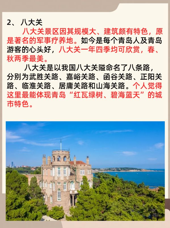 八大关景区因其规模大、建筑颇有特色,原是著名的军事疗养地。如今是每个青岛人及青岛游客的心头好,八大关一年四季均可欣赏,春、秋两季最美。