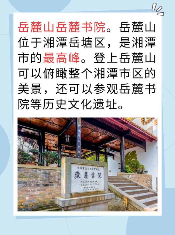 1.岳麓山岳麓书院。岳麓山位于湘潭岳塘区,是湘潭市的最高峰。岳麓山有着丰富的自然景观和人文景观,包括山峰、瀑布、古建筑等。登上岳麓山可以俯瞰整个湘潭市区的美景,还可以参观岳麓书院等历史文化遗址。