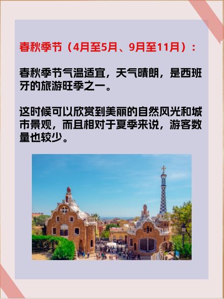 春秋季节(4月至5月、9月至11月):春秋季节气温适宜,天气晴朗,是西班牙的旅游旺季之一。这时候可以欣赏到美丽的自然风光和城市景观,而且相对于夏季来说,游客数量也较少。