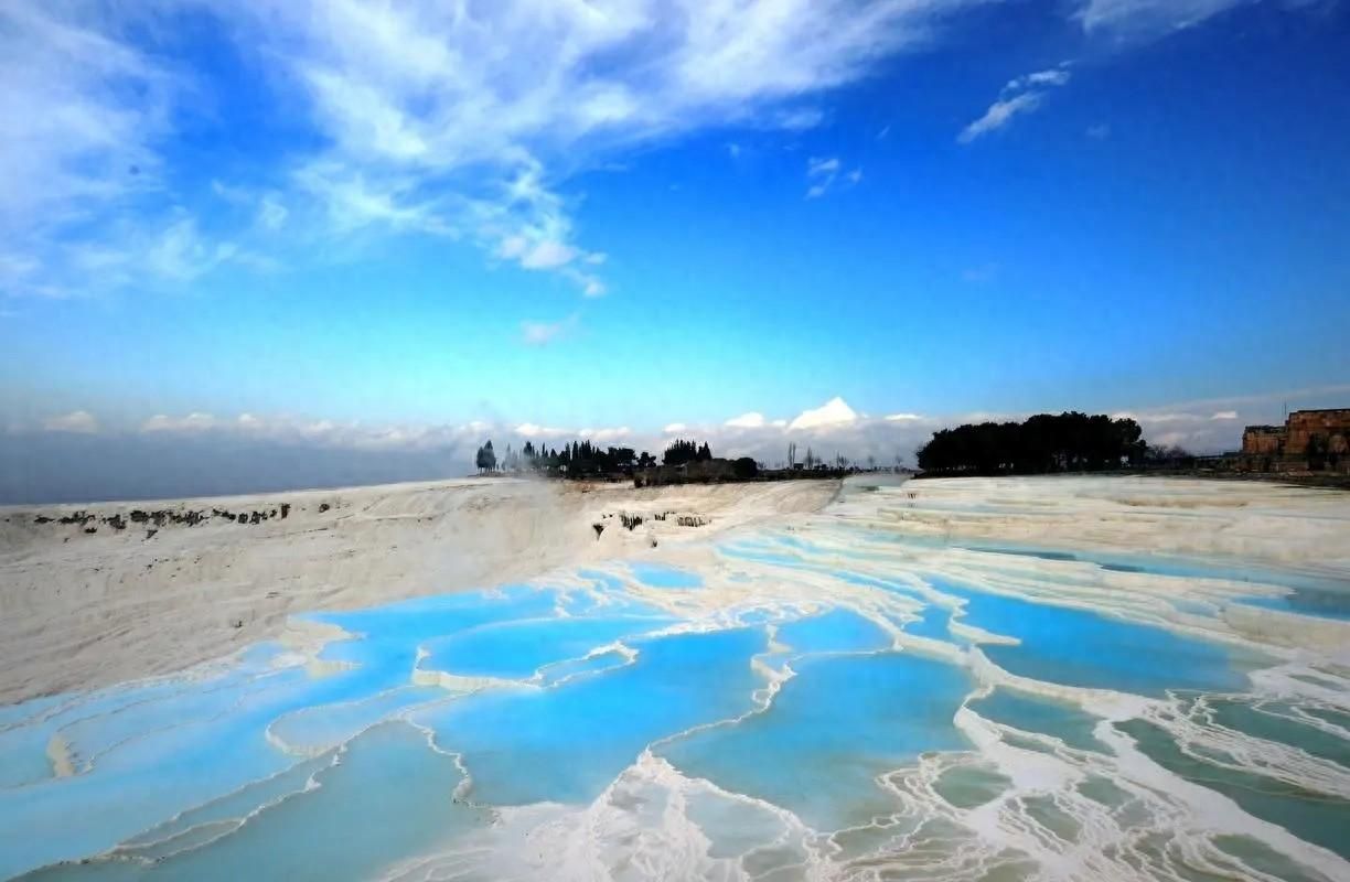 棉花堡,坐落于土耳其西南部,是大自然的杰作。远远望去,白色的钙华梯田层层叠叠,宛如一片片洁白的棉花铺设在大地之上。在阳光的照射下,这些钙华闪烁着银白色的光芒,显得异常耀眼。而与之相映成趣的,是那一池池湛蓝的泉水,它们宛如天空的倒影,清澈而深邃。